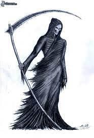 Vadiim kneeled on the floor to embrace her. Suddenly, a fluorescent light encompassed the room. Draped in a long, thick burlap black robe that covered his entire face and holding a sharp silver scythe, The Reaper appeared before them and was stunned to see Vadiim holding the girl.